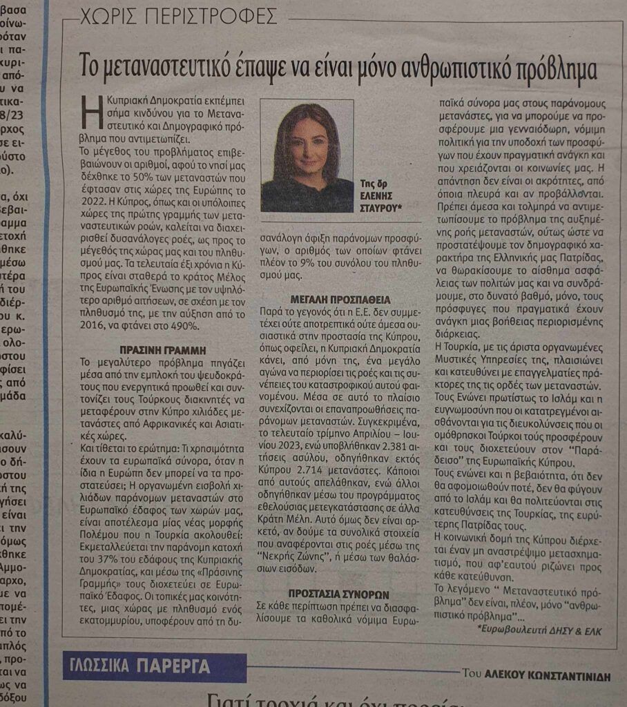 Και τίθεται το ερώτημα: Τι χρησιμότητα έχουν τα ευρωπαϊκά σύνορα, όταν η ίδια η Ευρώπη δεν μπορεί να τα προστατεύσει; Η οργανωμένη εισβολή χιλιάδων παράνομων μεταναστών στο Ευρωπαϊκό έδαφος των χωρών μας, είναι αποτέλεσμα μίας νέας μορφής Πολέμου που η Τουρκία ακολουθεί: Εκμεταλλεύεται την παράνομη κατοχή του 37% του εδάφους της Κυπριακής Δημοκρατίας, και μέσω της «Πράσινης Γραμμής» τους διοχετεύει σε Ευρωπαϊκό Έδαφος. Οι τοπικές μας κοινότητες, μιας χώρας με πληθυσμό ενός εκατομμυρίου, υποφέρουν από τη δυσανάλογη άφιξη παράνομων προσφύγων, ο αριθμός των οποίων φτάνει πλέον το 9% του συνόλου του πληθυσμού μας.